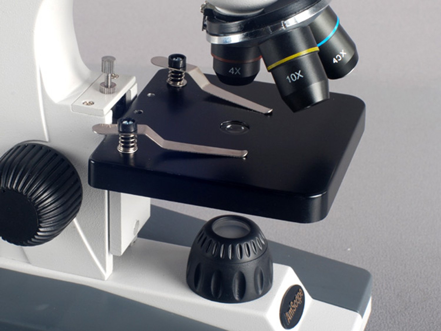 - Plain stage with stage clips to secure slide and a stage stop to prevent damage to slides or objectives