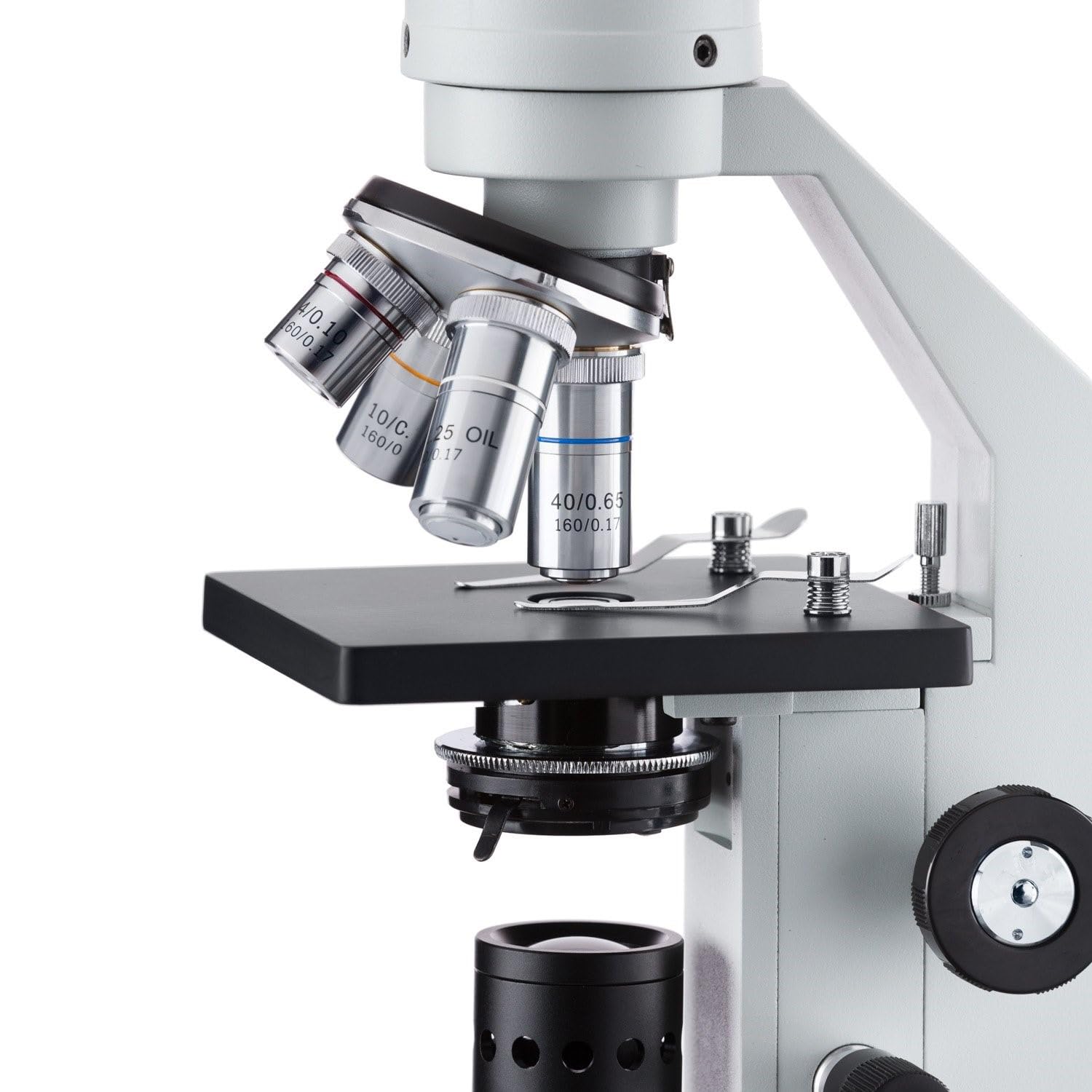 - Forward-facing nosepiece with precision-ground 4x, 10x, 40xS, and 100xS (oil) DIN achromatic glass objectives provide color correction of magnified images