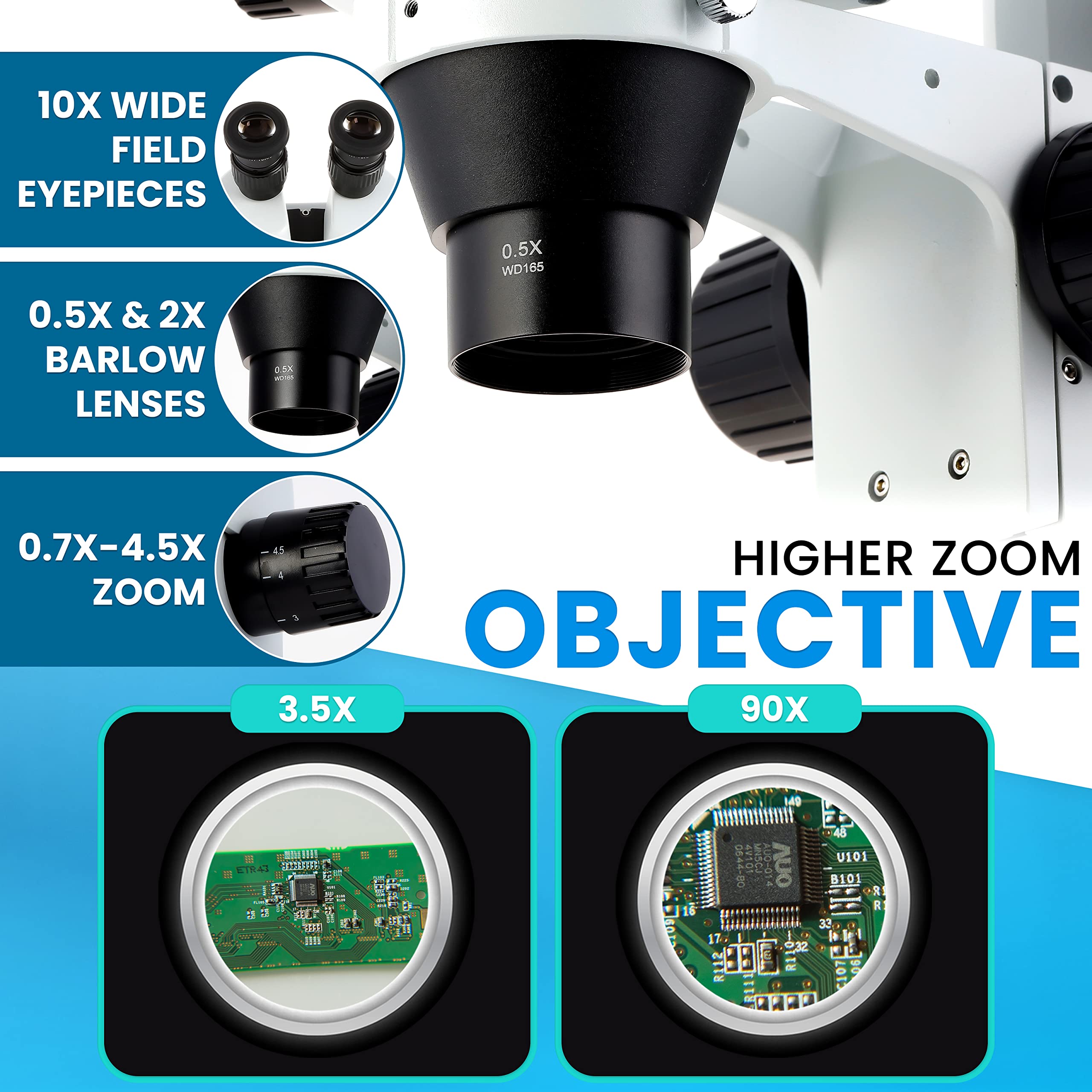 - Magnification: This microscope for adults has 3.5X-90X magnification with high-quality Greenough stereoscopic objective lenses, perfect for labs, engravers and repair shops