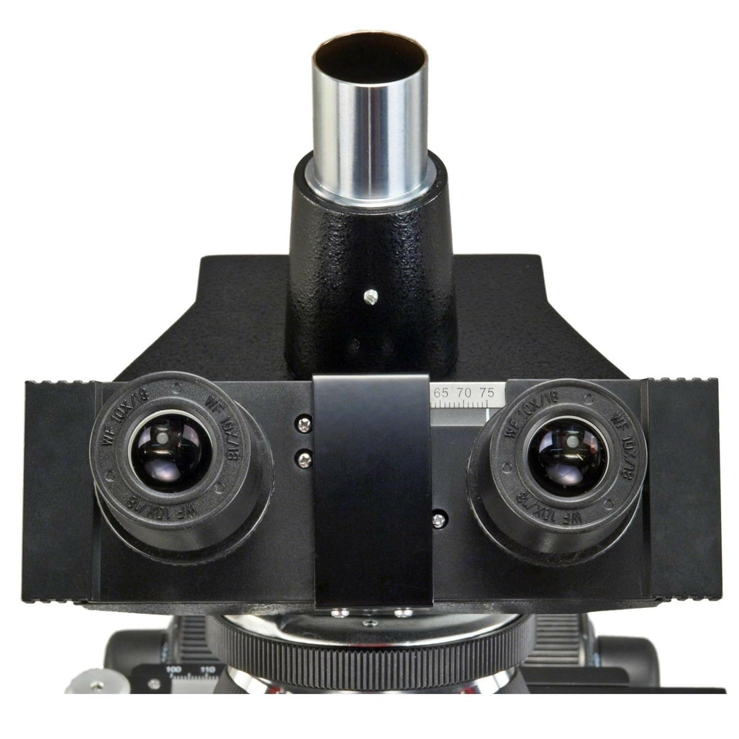 - Total magnification: 40X-100X-250X-400X-1000X-2500X; Eyepieces: wide field WF10X/18 and WF25X; Objectives: achromatic DIN 4X, 10X, 40X (S), 100X (S, Oil); Viewing head: 45 degrees inclined 360 degrees swiveling trinocular; Interpupillary distance: sliding adjustable 2-3/16inch ~ 2-15/16inch (55mm ~ 75mm); Diopter: adjustable on both eyepiece tubes; Nosepiece: revolving quadruple